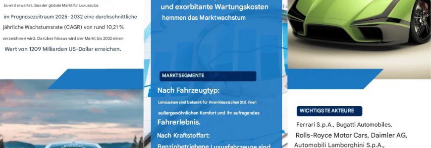 Eine analytische Übersicht von Report Cube, die Marktgröße, Segmentierung, Prognoseentwicklungen und regionale Einblicke in den Luxusautomobilmarkt aufzeigt, gestützt auf strukturierte Datensätze und Branchenforschungsergebnisse.