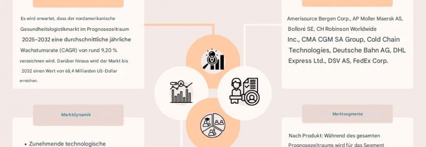 Eine analytische Übersicht von Report Cube, die Marktgröße, Segmentierung, Prognoseentwicklungen und regionale Einblicke in den nordamerikanischen Markt für Gesundheitslogistik aufzeigt, gestützt auf strukturierte Datensätze und Branchenforschungsergebnisse.