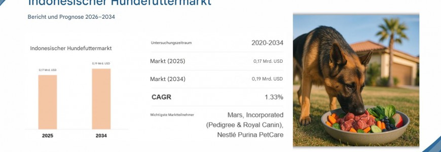 Laut dem Marktforschungsbericht „Indonesischer Hundefuttermarkt (2026–2034)“ von Report Cube wurde der Markt im Jahr 2025 auf rund 0,17 Milliarden US-Dollar geschätzt . Basierend auf der aktuellen Branchenstruktur und den beobachteten Nachfragemustern wird prognostiziert, dass der Markt bis 2034 auf 0,19 Milliarden US-Dollar anwachsen wird , was einem durchschnittlichen jährlichen Wachstum von 1,33 % im Prognosezeitraum entspricht.