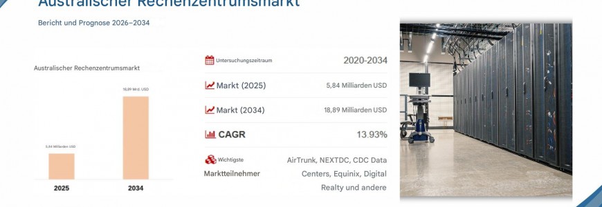 Laut dem australischen Rechenzentrumsmarktbericht (2026–2034) von Report Cube wurde der Markt im Jahr 2025 auf rund 5,84 Milliarden US-Dollar geschätzt . Basierend auf der aktuellen Branchenstruktur und den beobachteten Nachfragemustern wird prognostiziert, dass der Markt bis 2034 ein Volumen von 18,89 Milliarden US-Dollar erreichen und im Prognosezeitraum mit einer durchschnittlichen jährlichen Wachstumsrate (CAGR) von 13,93 % wachsen wird.